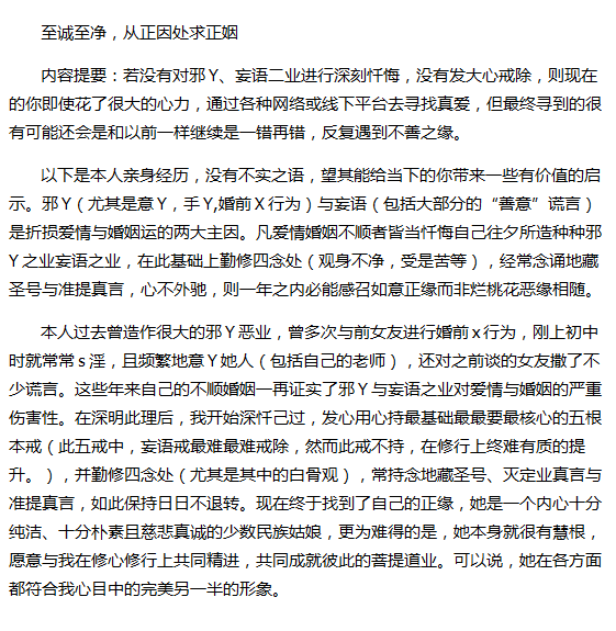 苦寻正缘的你:若没有对邪淫、妄语二业进行深刻忏悔,没有发大心戒除,则现在的你即使花了很大的心力,通过各种网络或线下平台去寻找真爱,但最终寻到的很有可能还会是和以前一样继续是一错再错,反复遇到不善之缘,你会发现,这些不善之缘常常与你一样有很明显的邪淫与妄语习气,两人在一起不久就会发现彼此很难如意相处,二人只是在互相利用、互相欺骗、互相伤害并最终不欢而散。唯从正因修,彻戒邪淫与妄语,方可得正缘善缘。