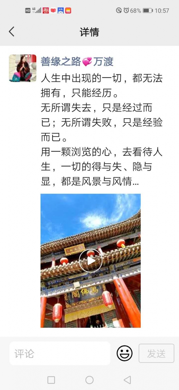 更新了一条心情: 人生中出现的一切,都无法拥有,只能经历。 无所谓失去,只是经过而已;无所谓失败,只是经验而已。用一颗浏览的心,去看待人生,一切的得与失、隐与显,都是风景与风情… 全文