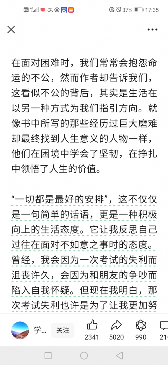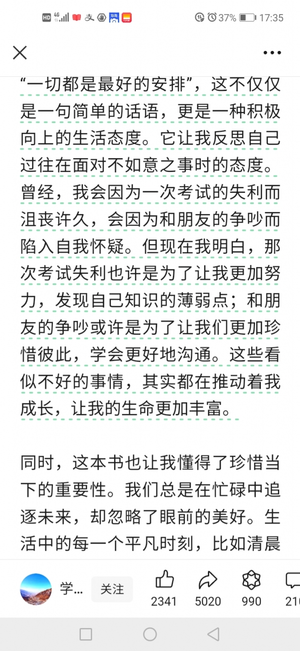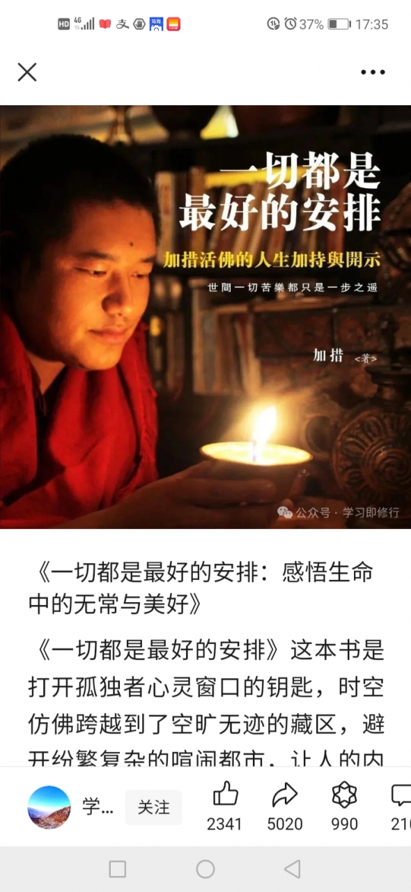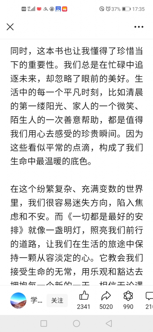 更新了一条心情: 《一切都是最好的安排:感悟生命中的无常与美好》 《一切都是最好的安排》这本书是打开孤独者心灵窗口的钥匙,时空仿佛跨越到了空旷无迹的藏区,避开纷繁复杂的喧闹都市,让人的内心得到了久违的宁静与平衡,这是一种极度舒适的独处修身方式,仿佛经历了一场灵魂的洗礼。这本书就像一位智慧的长者,在我耳边轻声诉说着生活的真谛。 全文
