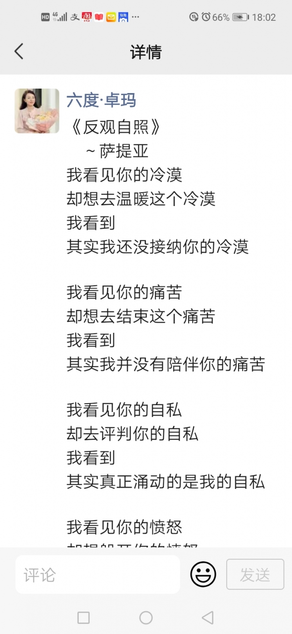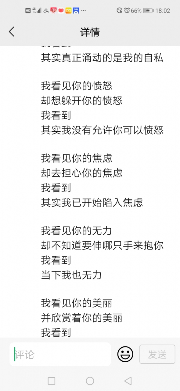 更新了一条心情: 《反观自照》 ~萨提亚 我看见你的冷漠 却想去温暖这个冷漠 我看到 其实我还没接纳你的冷漠 我看见你的痛苦 却想去结束这个痛苦 我看到 其实我并没有陪伴你的痛苦 我看见你的自私 却去评判你的自私 我看到 其实真正涌动的是我的自私 我看见你的愤怒 却想躲开你的愤怒 我看到 其实我没有允许你可以愤怒 我看见你的焦虑 却去担心你的焦虑 我看到 其实我已开始陷入焦虑 我看见你的无 全文