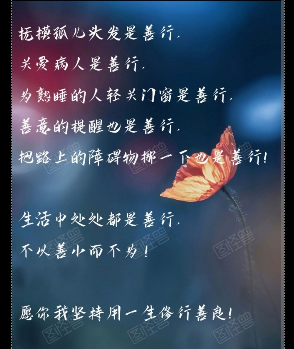 更新了一条心情: 抚摸孤儿头发是善行,关爱病人是善行,为熟睡的人轻关门窗是善行,善意的提醒也是善行 ,把路上的障碍物挪一下也是善行! 生活中处处都是善行,不以善小而不为, 愿你我坚持用一生修行善良! 全文