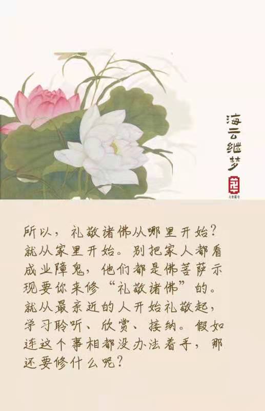 更新了一条心情: 媒介是平等的,重点在方法。 开示/ 海云和上 念佛诵经,哪一部经都一样,哪个菩萨圣号都一样,修法,持咒或者是参禅打坐,或者拜佛,这些统称为媒介,都是媒介。媒介是平等的,你用哪个媒介都不要紧,要的是方法。你这个方法能用上去,你的生命质量,本质就开始改造。因为会,第一个把杂质除掉,第二个把恶质除掉,第三个把本质显现出来,所以直接你就跟菩萨种性的生命相应。 全文
